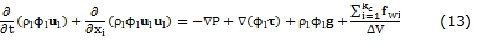 donde P, τi Φl ΔV son la presión, el tensor de esfuerzos viscosos del fluido, la porosidad y el volumen de una celda computacional, respectivamente. El término de transferencia de momentum fwi en (13) relaciona la sumatoria de las fuerzas de interacción entre el agua y las partículas presentes en una celda computacional.