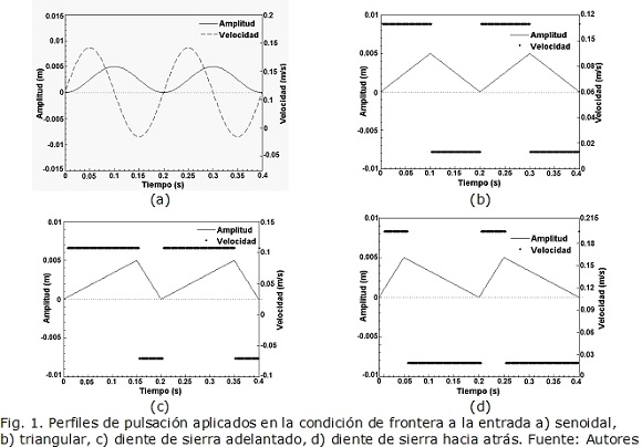 El flujo de agua, el cual es variable con el tiempo, se inyecta a través de la entrada de la cámara del jig de acuerdo con el perfil de pulsación simulado. La entrada de flujo para el perfil de pulsación senoidal se estableció utilizando una ecuación de onda seno, mientras que los otros perfiles utilizan la función escalón (ver Fig. 1). Los perfiles de pulsación se comparan con base en que la amplitud y frecuencia de pulsación se mantienen constantes en 5 mm y 0.2 s (o 300 ciclos/min) respectivamente, y solamente se cambia la forma del perfil. Los perfiles usados y sus abreviaciones son: senoidal (SENO), triangular (TRI), diente de sierra adelantado (STF) y diente de sierra atrasado (STB). Cada perfil incluye un periodo de fluidización con un movimiento de líquido hacia arriba (valor positivo en la velocidad) y un periodo de succión con un movimiento de líquido hacia abajo (valor negativo de la velocidad). En todos los casos se utilizó la misma dimensión de la malla para asegurar resultados comparables independientes del tamaño de la malla.