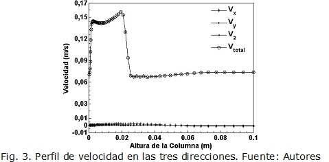 El flujo de líquido se consideró bidimensional en el dominio computacional analizado, ya que, mediante un caso de simulación tridimensional previo, la variación del campo de velocidad mostró ser muy significativa en la dirección axial (Vz) (ver Fig. 3), de esta manera se despreció el espesor de la columna del jig y solo se tomó en cuenta la altura y el ancho de la columna. Todos los perfiles de pulsación se estudiaron con un modelo bidimensional para lograr que los resultados sean aceptables para efectos de comparación.