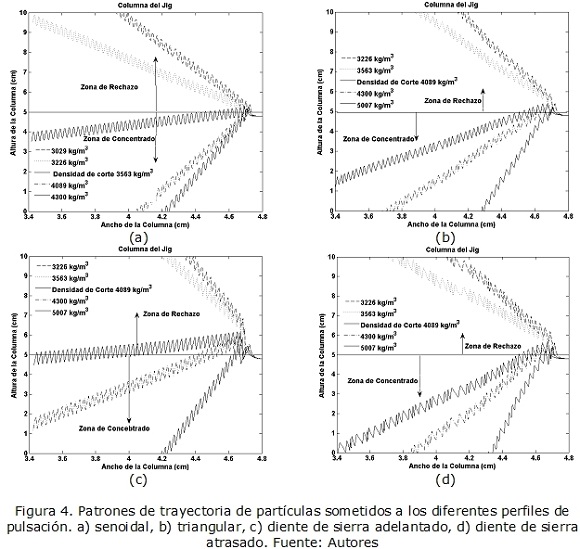 Inicialmente se revisan los patrones de trayectorias de partículas que pueden ayudar a entender el proceso de estratificación al interior de la cámara de separación del jig. Para todos los perfiles simulados, las partículas se inyectaron al interior de la columna del jig desde la misma posición (x=4.8 cm, y=4.8 cm) y a la misma velocidad (Vx=5.56 cm/s, Vy=0 cm/s), además poseen un diámetro fijo de 300 µm y una distribución de densidades en el intervalo de 3029 a 13822 kg/m3. La Fig. 4 muestra la trayectoria que siguen las partículas en el interior de la columna del jig, las cuales se obtuvieron con todos los perfiles de pulsación para cuatro valores característicos de densidad. Todos los perfiles revelan diferencias significativas en cuanto a la estratificación (separación) de las partículas y al valor de densidad de corte a la cual las partículas se reportan en la zona de rechazo o concentrado.