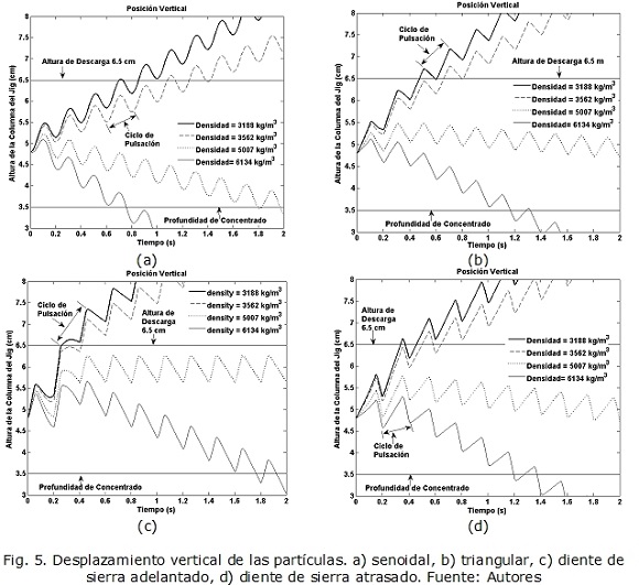 La posición del desplazamiento vertical (ver Fig. 5) describe el comportamiento de las partículas al interior de la columna del jig, graficando para los diferentes tipos de partículas la altura que alcanzan en la columna del jig respecto al tiempo. Todos los perfiles muestran estratificación gradual. Las posiciones verticales revelan que las partículas alcanzan la altura de descarga (rechazo) (6.5 cm) de mayor a menor en el siguiente orden: diente de sierra atrasado (2.2 ciclos), diente de sierra adelantado (3 ciclos), triangular (3.5 ciclos) y senoidal (6 ciclos). Y la profundidad de concentrado (3.5 cm) de mayor a menor de la siguiente manera: senoidal (3.5 ciclos), triangular (5.5 ciclos), diente de sierra atrasado (6.5 ciclos) y diente de sierra adelantado (9.5 ciclos). Se demuestra que la amplitud de la posición de las partículas es directamente proporcional a la velocidad máxima de pulsación aplicada a la entrada. Es decir, las partículas tienen la misma frecuencia de pulsación (se conserva el periodo de oscilación de la forma de onda) pero su amplitud es proporcional al valor de la amplitud de la velocidad aplicada a la entrada de la cámara del jig con cada uno de los perfiles de pulsación utilizados (Ver Fig. 1).