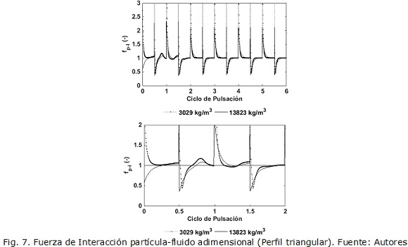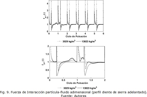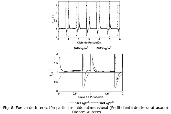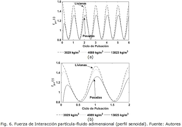 La Fig. 6 entrega los valores de fuerza con perfil de pulsación senoidal, donde se indica si las partículas livianas o pesadas tienen suficiente fuerza de interacción partícula-fluido para superar su respectiva fuerza gravitacional y lograr un movimiento ascendente. La fuerza de interacción partícula-fluido adimensional (f p-li) está dada como: