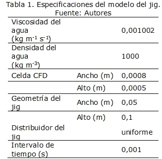 El modelo del jig consiste de un dominio rectangular ocupado con partículas esféricas y líquido. Las partículas inyectadas poseen un tamaño entre 125 µm a 2000 µm y una densidad entre 3026 kg/m3 a 13822 kg/m3. En total se utilizaron 17 fracciones de densidad distribuidas en el intervalo ([3029-13822]). Una configuración detallada del modelo se muestra en la Tabla 1