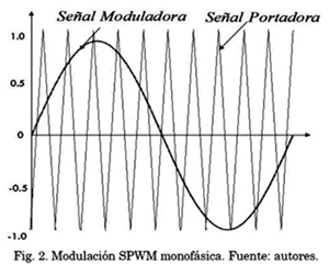 En la modulación SPWM la señal sinusoidal de frecuencia constante (moduladora) se compara con una señal triangular de mayor frecuencia (portadora), para definir las señales de conmutación de dispositivos de la misma rama que generan la señal de referencia de una fase. Para obtener las referencias de las otras dos fases, se repite el proceso considerando señales de la misma amplitud y desfasadas 120 grados. Una relación importante es el índice de modulación que relaciona la amplitud de la moduladora y la portadora, Fig. 2