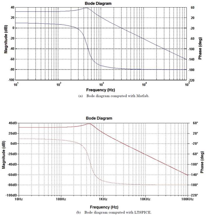 The proposed numerical model can be validated by using the frequency response of the circuit. Fig. 5(a) shows the Bode diagram with voltage v_C plotted in Matlab for the theoretical model, and Fig. 5(b) shows the Bode diagram with the voltage v C plotted in LTSPICE with the same values of the elements used for the experimental test. As shown in these figures, the frequency response for both the magnitude and phase of the output voltage v C are similar.