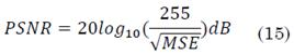 Donde f(x, y) es la imagen base y E(x, y) es la imagen con ruido, M y N son las columnas y las filas de las imágenes. Debido a que el Error Medio Cuadrático (MSE) depende del escalamiento de la intensidad de la imagen, esta relación es expresada en forma de una función logarítmica en unidades de decibeles para tratar de mantener una escala adecuada [36]. En (15) se presenta la conversión a decibles del MSE.