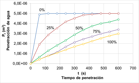 Fig. 7 Gráficas Penetración de agua (método RILEM) para cada uno de los tipos de mezcla (% de emulsión) en función del tiempo (0 % línea azul, 25 % línea roja, 50 % línea amarilla, 75 % línea verde y 100 % línea negra). En el eje de las abscisas se presentan los valores de Tiempo de penetración t (s) y en el eje de las ordenadas los valores de penetración de agua en el tiempo t (m3).