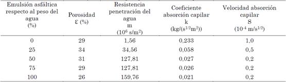En la Tabla 4 se presentan los resultados de porosidad, resistencia a la penetración del agua, coeficiente de absorción capilar y velocidad de absorción capilar, para cada una de las proporciones de adición de emulsión.