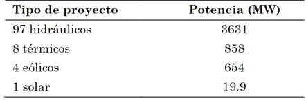Gracias a la estrategia de Pagos por Servicios Ambientales (PSA), implementada por el gobierno colombiano, se han dado grandes avances dentro de los esfuerzos tendientes a reducir la huella de carbono, siendo uno de los más claros ejemplos de PSA el BanCO2 que ha beneficiado a 2.600 familias y tiene casi 26 mil hectáreas conservadas [7]. De igual manera, dentro de dicho marco legal de políticas de desarrollo sostenible, se destacan los estímulos otorgados por la ley 142 y 143 de 1994, la llamada ley URE (Uso Racional de Energía) de 2001 y la más actual, y tal vez la más concerniente a este trabajo, la Ley 1715 de 2014 que regula la integración de las energías renovables no convencionales al sistema energético nacional. Dentro de dichas políticas, el Estado ha buscado fomentar la inversión privada procedente principalmente de Europa, Estados Unidos y en los últimos años de China, conformando tres grandes conglomerados generadores de energía (EPM, EMGENSA e ISAGEN), con grandes proyectos de interconexión en proceso como Ituango y Porvenir II, que buscan una línea de transmisión que entrelace el país con Centroamérica (Colombia-Panamá), con una capacidad de 100 MW y posteriormente con Ecuador con una capacidad de 300 MW. En la actualidad se están llevando a cabo otros proyectos, tal como se indican en la Tabla 1.