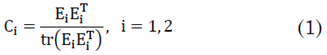 Por el contrario, existe un tipo especial de filtros denominados patrones comunes espaciales (CSP) [23], los cuales se construyen de forma supervisada, esto es, teniendo en cuenta la clase a la que pertenece cada segmento de señal EEG. Para la obtención de este filtro se parte del problema de maximización del cociente Rayleigh [38] asociado a las matrices covarianza de los segmentos de señal relacionados con las imaginaciones motoras. Sea E1 y E2 segmentos de señal EEG de N canales y h muestras para imaginación de movimiento de mano cerrada (clase 1) y mano abierta (clase 2). Las matrices de covarianza C1 y C2 asociadas a E1 y E2 respectivamente se obtienen mediante la siguiente expresión (1):