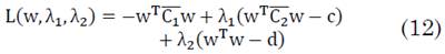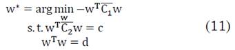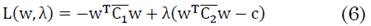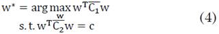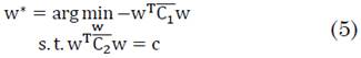 Nótese que si w* maximiza el Cociente de Rayleigh entonces cw* también maximiza este cociente dando el mismo valor. Luego entonces el problema de optimización en (3) puede ser planteado como un problema con restricción (4):