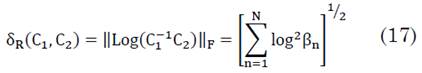 Las matrices de covarianza simétricas y definidas positivas, Ci, pueden ser utilizadas como representación de las señales EEG, Ei. Este tipo de matrices simétricas y definidas positivas pertenecen a una forma particular de variedad matemática conocida como variedad de Riemann, C(N). En esta variedad matemática, la distancia Riemanniana de dos matrices, C1 y C2, viene dada por (17):