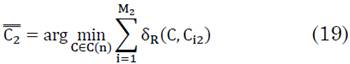 . La discriminación de una matriz C se hace por menor distancia a las matrices promedio anteriores. Para encontrar estas matrices promedio, no es posible utilizar la fórmula de media de aritmética de matrices convencional, utilizada en la sección anterior, ya que las matrices de covarianza no residen en el espacio euclídeo sino en una variedad Riemanniana. En este espacio la matriz promedio asociado a M1, matrices de covarianza para la clase 1 y M2 matrices de covarianza para la clase 2, se obtiene resolviendo los siguientes problemas de optimización respectivamente (18) y (19):
