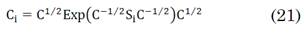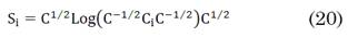 ) es el logaritmo de una matriz, el cual se calcula, con ayuda de la descomposición en valores singulares de C mediante el siguiente producto de matrices: U(diag[ln(𝛽1), … ,ln(𝛽n)])U𝑇, donde U es la matriz de autovectores de C. ‖⋅‖F es la norma de frobenious de una matriz, la cual se obtiene como la raíz cuadrada de la traza del producto entre la matriz y su transpuesta.