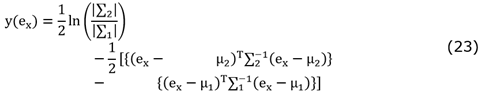 Los vectores de varianza logarítmica de la sección 2.1 y las vectorizaciones de las proyecciones en el espacio tangente de un punto sobre la variedad de Riemann de la sección 2.2 se asocian a cada una de las señales EEG con su respectiva clase. Para estos patrones es posible desarrollar técnicas de clasificación basadas en análisis discriminante cuadrático (QDA) o lineal (LDA) [26]. Primero, asumiendo que estos patrones poseen una distribución normal, que las probabilidades a priori de ambas clases son iguales y además que la media y covarianza para la clase 1 y 2 viene dado por