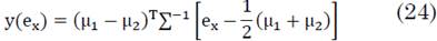 entonces la discriminación se puede obtener de forma lineal (LDA) mediante (24). Ambas expresiones (23) y (24) permiten clasificar a ex perteneciente a la clase 1 si y ≥ 0 y a la clase en 2 en caso contrario.