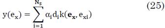 Las máquinas de vectores de soporte son otra opción robusta para clasificar ex mediante (25). Ns es el número de vectores de soporte obtenidos después de optimizar el problema dual asociado a la maximización del margen de separación entre las clases, αi son los multiplicadores de Lagrange no nulos obtenidos de este mismo problema, di son las etiquetas (+1 para la clase 1 y -1 para la clase 2) de los vectores de soporte y 𝑒𝑥𝑖 son los vectores de soporte los cuales son un subconjunto de los datos de entrenamiento [27]. En este caso y ≥ +1 clasifica para la clase 1 e y ≤ -1 clasifica para la clase 2.