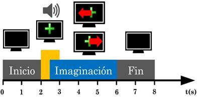 Fig. 2 Esquema de tiempo para imaginación motora. El segmento en azul corresponde al periodo de tiempo en el que se extrae una época de señal EEG asociado con el tipo de movimiento que debe realizarse con base en la dirección de las flechas