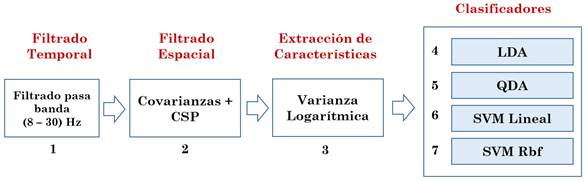 Fig. 4 Cuatro arquitecturas de BCI basadas en CSP: CSP+LDA (1-2-3-4), CSP+QDA (1-2-3-5), CSP+SVM Lineal (1-2-3-6) y CSP+SVM Rbf (1-2-3-7)
