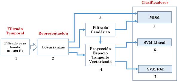 Con ayuda de las funciones discriminantes descritas en la sección 2.3 y las técnicas desarrolladas en las secciones 2.1 y 2.2 es posible concebir diez arquitecturas de interfaces cerebro- computador: cuatro basadas en CSP (Fig. 4) y seis basadas en geometría de Riemann (Fig. 5).