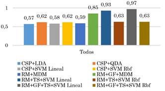 En la Fig. 6 se observa que todos estos valores están por encima del nivel de azar estimado para este caso. Nótese que la arquitectura RM+TS+SVM lineal presenta la mejor precisión promedio entre todas las arquitecturas. Para determinar cuál o cuáles fueron las mejores miBCI por sujeto, se comparó el desempeño de cada una de estas utilizando el área bajo la curva ROC, AUC [43]. En la Tabla 6 se muestran estos valores obtenidos. Estos mismos datos son graficados en la Fig. 7 para propósitos de comparación visual.