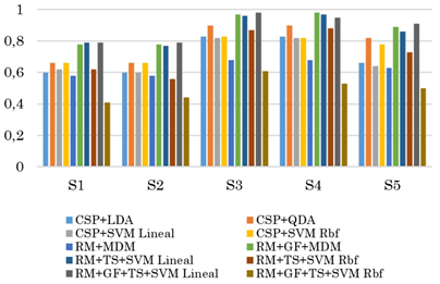 Y, en segundo lugar, se observa que mientras las miBCI en los sujetos con lesiones cervicales (S1 y S2) presentan un desempeño regular, en los sujetos de control se logran miBCI con desempeños buenos (S5: 0.91 - miBCI: RM+GF+TS+SVM Linear) y muy buenos (S3, S4: 0.98 - miBCI: RM+GF+TS+SVM Linear, RM+GF+MDM). El bajo desempeño de las arquitecturas propuesta con respecto a los sujetos de control puede deberse a la reorganización de la actividad cortical sensomotora [45] que tiene lugar en los pacientes que han sufrido lesiones en el sistema nervioso central como es el caso de los pacientes con lesiones cervicales, lo que indicaría que es necesario una reubicación de los electrodos sobre el cuero cabelludo de los sujetos con lesiones medulares para obtener bioseñales más discriminantes. Es posible que una sintonización de los hiperparámetros (los cuales se dejaron fijo para este estudio) mejore el desempeño particular las miBCI de Riemann que utilizan SVM de kernel gaussiano.
