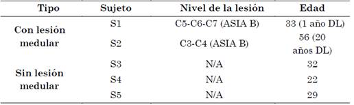 En este estudio se adquirieron segmentos (épocas) de señales EEG asociadas a imaginación de mano cerrada e imaginación de mano abierta de cinco sujetos con edades entre 22 y 56 años, dos de ellos con lesión cervical (S1 y S2) y tres sin ningún tipo de lesión (S3, S4, y S5) (Ver Tabla 1.). De acuerdo con los especialistas médicos, ninguno de los sujetos de prueba presentó limitaciones cognitivas ni daño cerebral que impidiera la participación de los sujetos de experimentación. Asimismo, los sujetos dieron consentimiento informado respecto a las pruebas realizadas y los datos adquiridos.