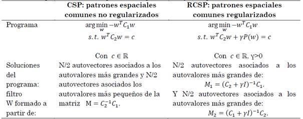 En síntesis, la obtención de un filtro 𝑊 ∈ ℝN𝖷N tipo CSP junto con sus versiones regularizadas y no regularizadas se compilan en Tabla 2.