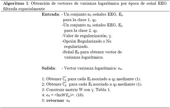 Nótese que dado que 𝑊Ei ∈ ℝN𝖷h, cada componente de ei se obtiene aplicando el logaritmo natural a la varianza de cada canal de WEi, lo que hace que finalmente ei ∈ ℝN. El Algoritmo 1 (ver Tabla 3.) describe el procedimiento para la obtención de un vector de varianza logarítmica para una señal EEG, Ex, filtrada espacialmente.