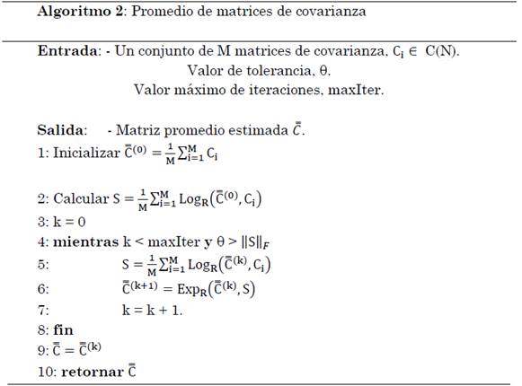 No hay una forma explícita para resolver el problema anterior, pero existen formas iterativas para estimarlo, utilizando el concepto de espacio tangente. Con ayuda del logaritmo Riemanniano entre dos matrices, LogR (C, Ci), se proyecta el conjunto de datos completo, Ci (i=1…M), matrices de covarianza, en el espacio tangente de C. En este espacio, por cierto, de propiedades euclidianas, el promedio puede obtenerse mediante media aritmética. Finalmente, se reproyecta este promedio obtenido al espacio SPD mediante la exponencial Riemanniana entre dos matrices, ExpR (C, Ci). Después de algunas iteraciones, se obtiene la media geométrica de las matrices SPD. Las iteraciones se detienen cuando se ha realizado un número determinado de iteraciones o cuando la distancia de Frobenius de la proyección tangente promedio se hace estacionaria. Ver Algoritmo 2 (ver Tabla 4.).