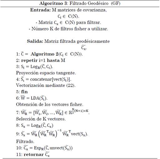 La √2 se multiplica a todos los elementos que están por fuera de la diagonal principal de S para que ǁSǁF = ǁvect (S)ǁ2. La desvectorización de vect (S) se realiza de forma contraria. Nótese además vect (S) que tiene N(N+1)/2 elementos. Esta forma de vectorización permite la construcción de técnicas de filtrado geodésico (GF) como el propuesto en [29] y descrito en el Algoritmo 3 (ver Tabla 5.). La idea básica de este algoritmo es utilizar el análisis discriminante lineal de fisher para la construcción de un filtro a partir de los K vectores de fisher de las proyecciones de las matrices de covarianza en el espacio tangente de la media riemanniana de un conjunto de M matrices de covarianza. Para el caso de señales EEG, este filtro debe obtenerse a partir de todas las épocas tanto de imaginación izquierda como derecha.