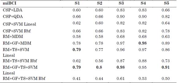 En primer lugar, se observa que independiente del sujeto, los resultados de las miBCI basadas en geometría de Riemann presentaron en promedio un 31 % de desempeño mayor que las basadas en CSP. Sobresalen por su desempeño las siguientes miBCI: RM+GF+MDM, RM+TS+SVM lineal y la RM+GF+TS+SVM lineal. La superioridad en desempeño de las arquitecturas basadas en Riemann respecto a las basadas en CSP se debe a: i) la estimación de las matrices de covarianza promedio por clase en el caso de CSP no es óptima [44], desde el punto de vista topológico en el espacio de matrices positivas definidas; ii) la obtención de los autovalores y autovectores no tiene en cuenta la dispersión entre clases; iii) la extracción de características mediante el operador de varianza logarítmica se calcula mediante una aproximación de la distancia de Riemann entre matrices de covarianza [44]. Nótese además que las únicas arquitecturas basadas en geometría de Riemann que presentan desempeños inferiores, incluso por debajo que las basadas en CSP, son las que utilizan SVM de kernel gaussiano como clasificador.