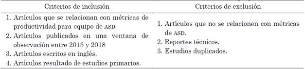 En [17], se analizó literatura sobre investigaciones vinculadas a factores que inciden en la productividad en asd, frente a lo cual se identificaron los conceptos, los métodos más utilizados, los niveles y las métricas de productividad. El análisis se hizo mediante un estudio de mapeo sistemático (sms), en el que se seleccionaron 25 artículos.