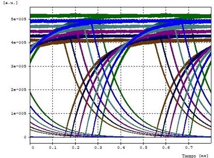 En la (Fig. 17) se puede ver la variación del diagrama del ojo con la distancia (cerrándose proporcionalmente) para la señal de datos/voz medida en el receptor.