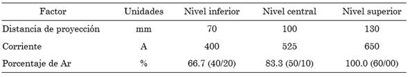 Por ejemplo, en la evaluación del efecto de la PSD de la materia prima, se utilizaron dos polvos, uno con una PSD de -45 +11 µm y otro con una PSD de -106 +38 µm, y se fijaron las demás condiciones de fabricación en 600 A en el arco eléctrico, 46/14 como relación de gases formadores del plasma, 70 mm de distancia de proyección y las condiciones fijas (PFAPS) presentadas en la (Tabla 3).