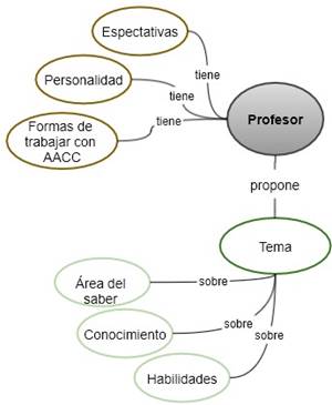 La red semántica propuesta se compone de tres nodos principales (estudiante, profesor y familia), que son los generadores del conocimiento. El nodo profesor (Fig. 2) tiene dos ramificaciones, que permiten representar las características del profesor y los temas que puede proponer para el material a co-crear con base en su conocimiento.