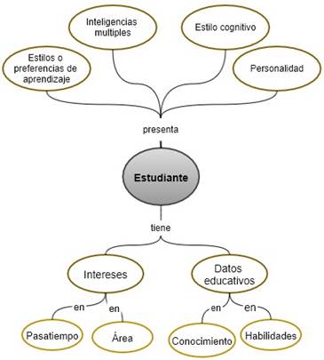 El nodo Estudiante (Fig. 4) tiene dos ramificaciones, ya que, según [16], este ostenta dos tipos de características: intelectuales y no intelectuales; a saber, las intelectuales son: personalidad, estilos de aprendizaje, estilo cognitivo y la inteligencia múltiple que puede ser lógico-matemática, lingüística verbal, visual-espacial, corporal, musical, interpersonal, intrapersonal y naturista. En consecuencia, las no intelectuales son: intereses (pasatiempo y área) y datos educativos (habilidades y conocimientos).