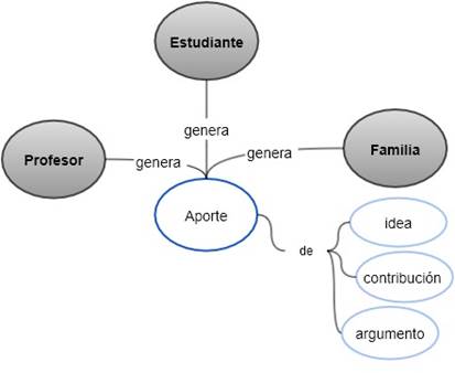Por último, en la red Semántica (Fig. 5), los nodos principales (profesor, padre y estudiante) tienen una conjunción en un nodo secundario que hemos denominado Aporte. En este, se representan los aportes de cada uno de los participantes del proceso, que se clasifican en diferentes tipos (idea, contribución o argumento), según la fase del proceso en la que se han realizado.