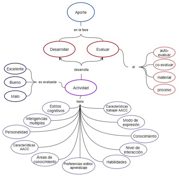 Mediante las redes semánticas, el conocimiento representado en el sistema podrá ser comprensible y utilizado por estudiantes con aacc, profesores y padres de familia. Además, como la información y conocimiento provienen de diferentes procesos de co-creación y no tienen una jerarquía, no son necesarias tecnologías como los frame.
