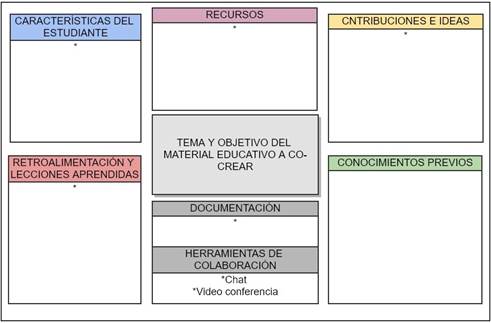 Posteriormente, una vez iniciado el proceso de co-creación, con ayuda del sistema de conocimiento creado, se sugería a los participantes las actividades colaborativas para la selección del tema del material a co-crear y la generación de los objetivos del proceso, del material y sus ideas. Finalmente, los participantes colaboraban para evaluar el proceso y el material.