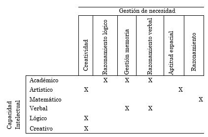 Según [16], los estudiantes con aacc tienen características intelectuales y no intelectuales. Las primeras obedecen a la forma en que relacionan sus capacidades intelectuales con la gestión de sus necesidades como se muestra en la (Tabla 1).