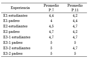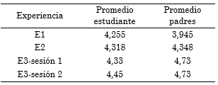 En la primera columna, se indica a qué experiencia o sesión corresponden los valores, y en las dos siguientes columnas, se presenta el promedio de las respuestas de los estudiantes y de los padres de familia.