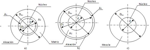 Fig. 1 Esquemas geométricos de la conformación de los revestimientos en los electrodos a) doblemente revestido (la carga de aleación interna) b) doblemente revestido (la carga de aleación externa) c) simplemente revestido
