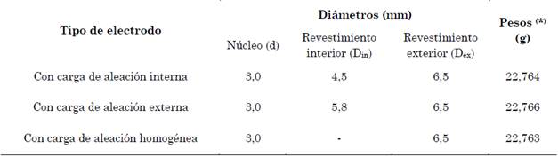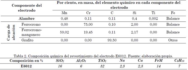 Se fabricaron tres tipos de electrodos con la misma composición química para el núcleo metálico y la carga de aleación ver Tabla 1. Igualmente, se empleó el mismo revestimiento ver Tabla 2, similar al de un electrodo E6012 [2]. El revestimiento de la carga de aleación para cada tipo de electrodo ocupó la misma área de la sección transversal del revestimiento, por tanto, la misma medida en el volumen y masa totales del revestimiento. El aglutinante empleado también fue común para todos los electrodos: silicato de sodio, con una densidad de 1,44 a 1,48 g/cm3, ocupando entre un 28 % y 30 % de la masa total del revestimiento.