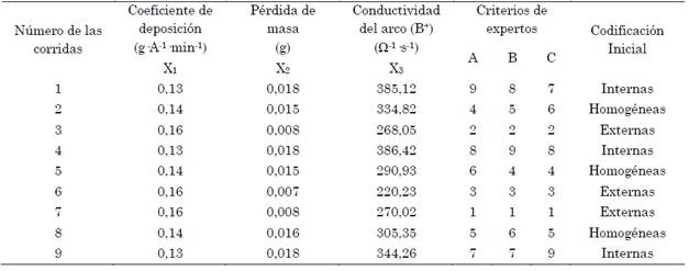 De la Tabla 5 se puede apreciar en la pérdida de masa que el factor X2 es el que mayor significación obtuvo en la evaluación de los expertos, siguiendo en orden descendente el coeficiente de deposición (X1) y la conductividad del arco (X3).