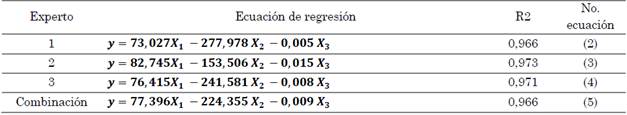 Tabla 5 Ecuación de regresión obtenida según el criterio de evaluación de cada experto