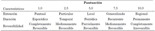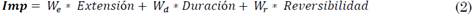 El término (W) significa factor de ponderación, en este caso para los tres impactos: extensión, duración y reversibilidad. El peso de ponderación empleado fue: peso extensión (We) de 0,30, mientras el peso de la duración (Wd) y de la reversibilidad (Wr) fue de 0,35.
