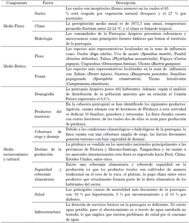 Los principales hallazgos determinados en la línea base de la zona de cultivos de pitahaya de tipo Parroquia Arapicos, se presentan en la Tabla 4: