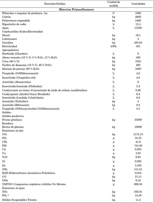 En los criterios analizados del balance de masa del proceso productivo, las principales entradas son los insumos agroquímicos, plántulas, combustible, energéticos y agua necesaria. Mientras, en las salidas, las cantidades más representativas son cantidades de fruta lista para la comercialización, envases vacíos de agroquímicos, residuos sólidos, restos de poda de las cosechas, aguas residuales de las instalaciones de beneficiado y las emisiones gaseosas estimadas a partir del consumo de combustible y del uso de fertilizantes, entre otros. La Tabla 5 muestra, las principales corrientes de entradas y salidas de una hectárea de 4 años de sembrada.