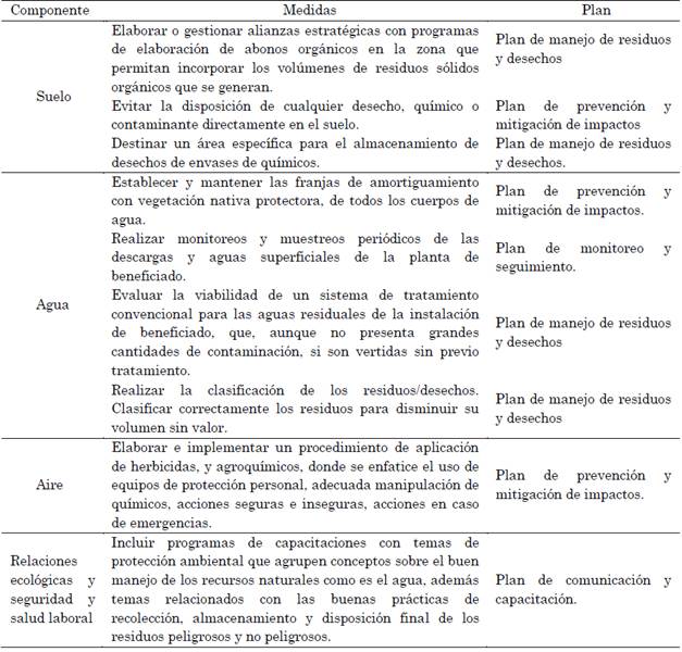 Para el suelo y la generación de residuos tanto peligrosos como comunes se implementará un sistema de recolección y de igual forma de clasificación de los mismos para disminuir su volumen antes de su disposición final en el relleno sanitario, medida apoyada también por [30], los residuos sólidos y líquidos de las instalaciones de beneficiado se manejarán por separado de los residuos de la cosecha y se proporcionarán instalaciones adecuadas de agua potable y lavado a ubicaciones. Además, en la zona existen varios programas de aprovechamiento de abonos orgánicos, y la producción de compostaje con los residuos puede generar buenos rendimientos productivos [31], lo que generaría ingresos económicos para los pobladores de la comunidad.